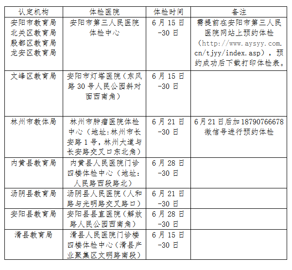 体检要求:所有体检人员早7:30,空腹,持本人身份证和贴网报照片的体检表(正反面打印)到指定医院体检。《河南省教师资格申请人员体检表》可从河南省教师资格网(jszg.haedu.gov.cn)下载。(10点以后不再体检)